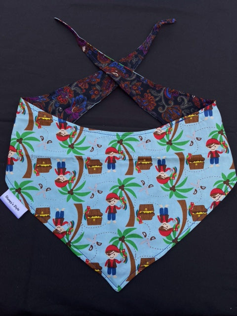 This bandana has pirates with trees and treasure chests on a light blue background on one side and a abstract floral pattern on a black background on the other side!