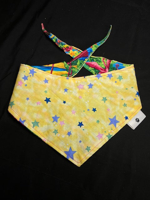 This bandana has a bright forest scene with pink flamingos on one side and lots of little stars on a yellow background on the other side!