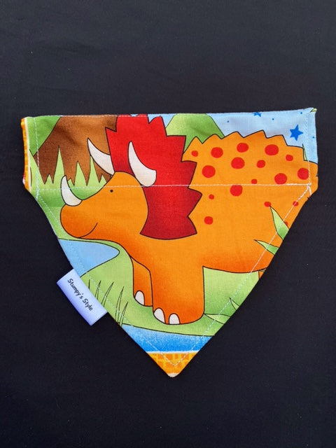 This bandana has a large dinosaurs with forest scenery on one side and a blue star and some purple lines on a red background on the other side!