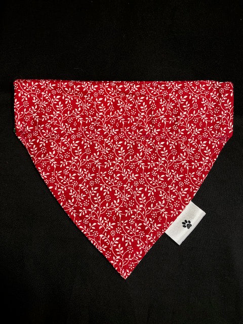 This bandana has lots of holy on a dark green background on one side and a delict white floral pattern on a red background on the other side!