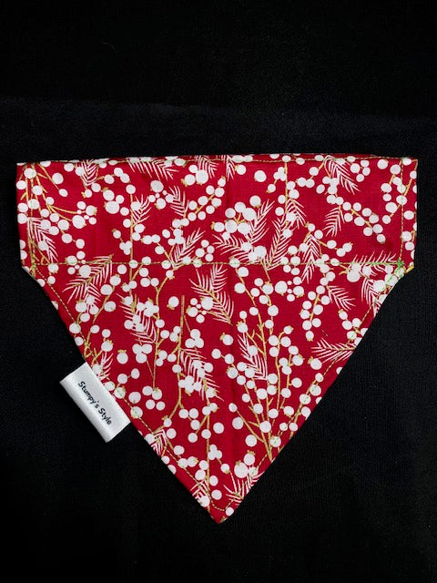 This bandana has lots of mistletoe on a red background on one side and robins and holy on a white background on the other side!