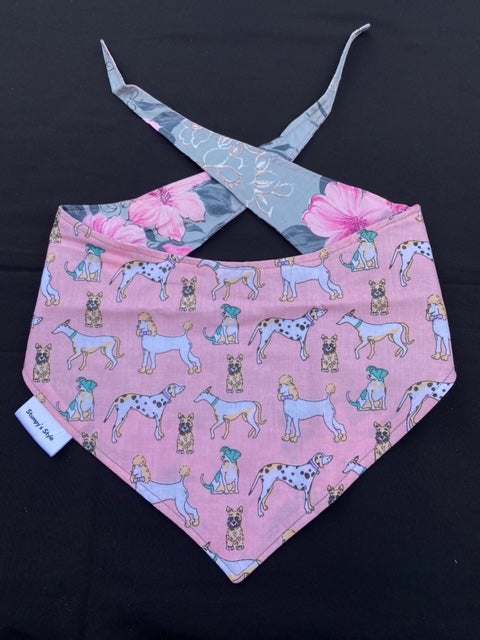 This bandana has lots of different dogs on a pink background on one side and a large pink floral pattern on a grey background on the other side!