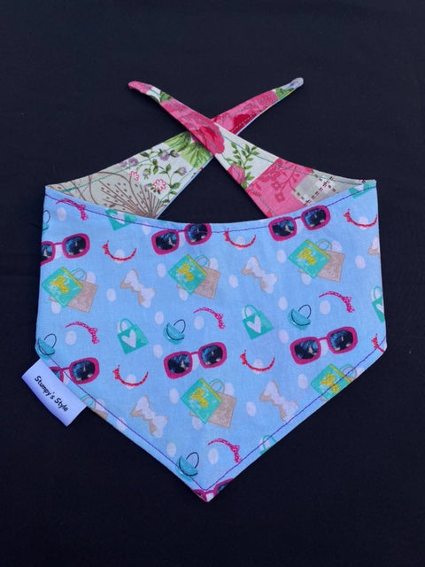 This bandana has lots of pink sunglasses and shopping bags on a light blue background on one side and a pink and purple abstract checked floral pattern on the other side!