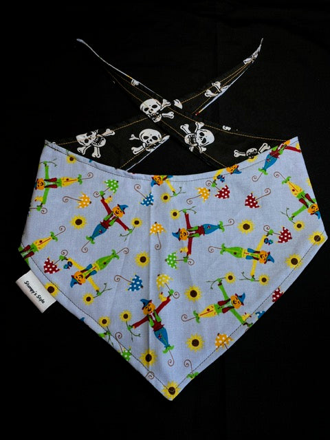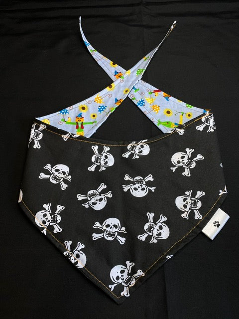 This bandana has lots of pumpkin headed scarecrows on a blue background on one side and lots of skull and cross bones on a black background on the other side