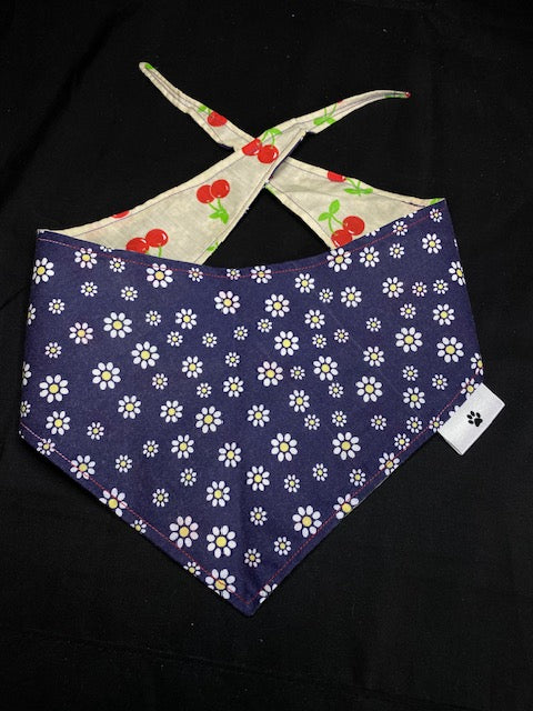 This bandana has lots of cherry bunches on a cream background on one side and has lots of little daisy's on a dark blue background on the other side!
