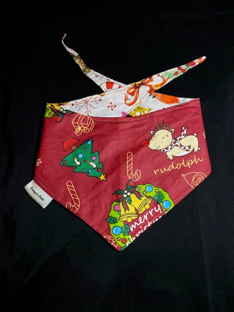 This bandana has Christmas themed images like reindeer and candy canes on a red background on one side and large robins, bells and holly on a white background on the other side!