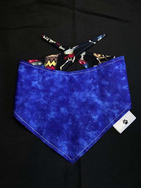 This bandana has lots of dancing skeletons on a black background on one side and skull and on a plain blue mottled background on the other side!